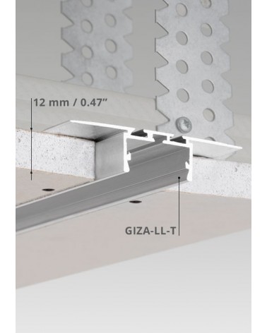 Das GIZA-LL-T Profil ist in Gipskartondecken / Gipskartonwänden einsetzbar. Dieses Profil ist ausgelegt vor allem für die Gipskartonplatten der Stärke von 12,5 mm. Nach dem Befestigen und Verputzen des Profils mit Feinputz sind keine Aluminium Elemente des Profils mehr sichtbar, nur eine schmale Lichtlinie, die mit der Oberfläche bündig ist.
